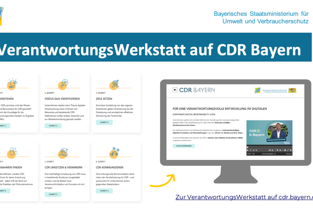 Kurzbeschreibung: Die kostenfreie digitale VerantwortungsWerkstatt unterstützt Unternehmen, CDR Schritt für Schritt in den Unternehmensalltag zu integrieren. Mit einer Lernreise, praxisnahen Tools, Workshopkonzepten u.v.m. werden Organisationen begleitet Digitalisierung verantwortungsvoll und im Sinne der Verbraucher umzusetzen. Das Angebot richtet sich insbesondere an KMU und fördert Transparenz, Vertrauen in Technologien und gesellschaftliche Verantwortung bei der Gestaltung der Digitalisierung.