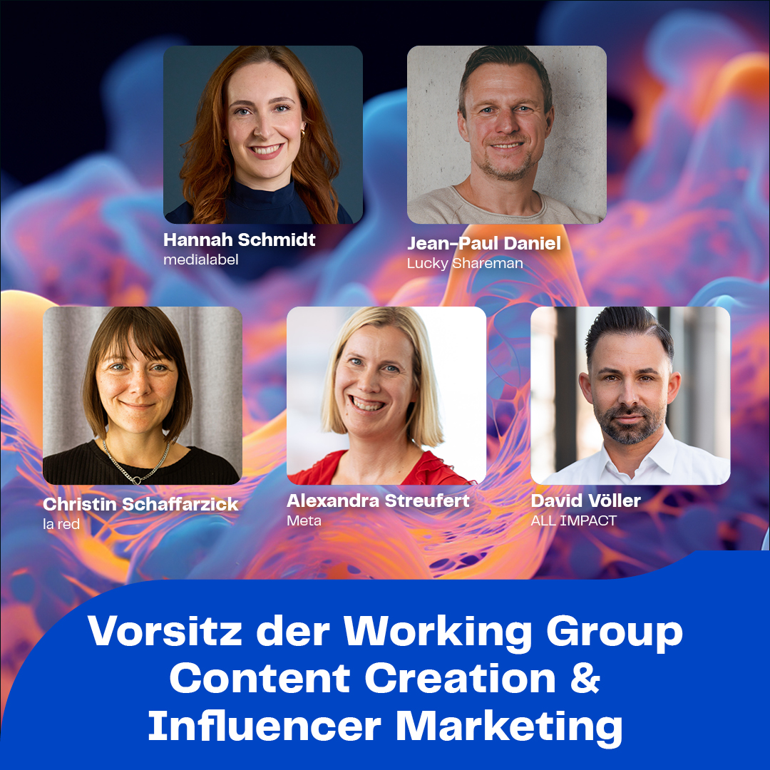 Die Working Group „Content Creation & Influencer Marketing“ im BVDW schafft den Raum, diese Entwicklungen aktiv zu begleiten und mitzugestalten. Wir wollen aufklären, uns austauschen, Meinungen entwickeln und vertreten, um dieses dynamische Feld für alle sinnstiftend voranzubringen.